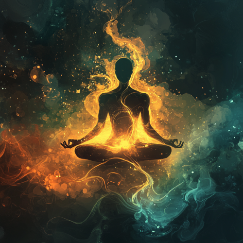 An illustration depicting a serene figure in a meditative posture, surrounded by subtle elemental representations--wind, water, and fire. The figure's breath is visually represented as flowing energy, with particles of light moving in and out of the body, symbolizing healing and connection to nature. The scene should evoke a sense of tranquility, healing, and the deep connection between breath and the elements.