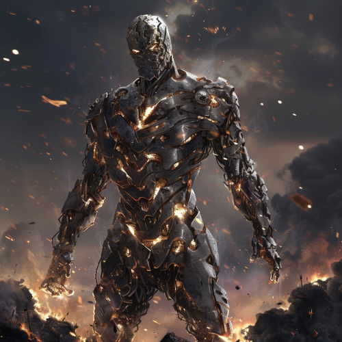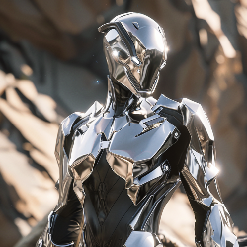 A humanoid Aluminum Elemental in a fantasy world, with a sleek, silvery metallic body that shimmers in the light. The elemental has smooth, reflective skin, angular limbs, and glowing eyes. Its form is elegant and sharp, resembling futuristic armor. In the background, there is a metallic landscape with abstract structures made of aluminum, reflecting light. The scene should feel otherworldly, with a cool, metallic color palette emphasizing the aluminum theme. --v 6.0