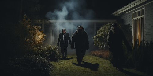 two angry giant Trolls chasing 3 scared security guards wearing dark sunglasses and dark suits, pants on fire , in a garden in front of a Norwegian Villa at night under the full moon, Film style, 40 mm, Agfa Vista Plus 200, Canon RF35mm, 1/250, --ar 2:1 --v 5.2