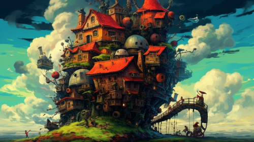 chaos of perfect silence and darkness lay between the homeland of elemental fire and the homeland of elemental ice, vibrant colors, painting, ultra sharp, highly detailed, full size, Color Grading, insane detail, intricate detail, beautifully colored, in the style of the anime the moving castle --s 1000 --v 5.1 --ar 16:9