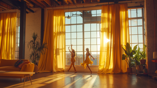 Several women dancing in a Parisian loft. The loft has a glass roof, no windows, and hardwood floors. Modern paintings are on the walls. Champagne bottles and one black bottle of a perfume with golden cap are on a black table. A young Western woman with long brown hair is holding a cocktail in her hand. She is wearing a soft peach off-shoulder puffy dress with a large skirt. She is siting on a beige sofa next to a fluffy black and grey cat. Real photo.