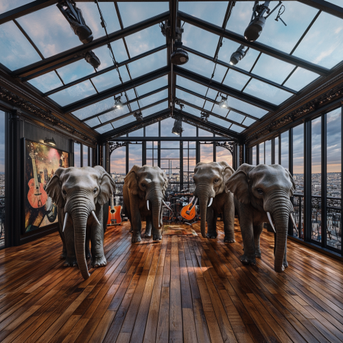 Elephants dancing in loft with artist journalist holding cocktail.