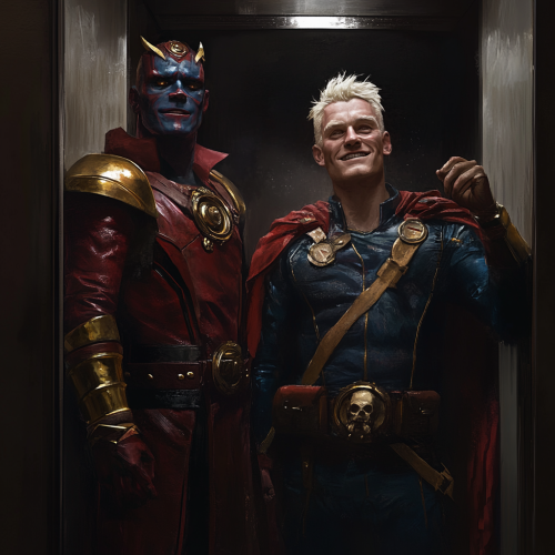 homelander and butcher standing in elevator, devious looks in their eyes, facing forward and readying fists to fight some unknown threat in front of them, smiling deviously, hyper-realistic