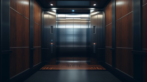 Modern elevator interior with mirrors, wheelchair accessibility focus, clean aesthetic, soft lighting, realistic style, architectural visualization --ar 3:2 --s 750 --style raw