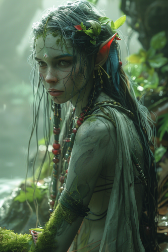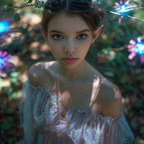 extreme close up, colour photograph taken from high camera angle. a slim slender beautiful pretty 18 year old high elf noblewoman, she has perfect flawless skin. dressed in a fantasy style airy light lose gossamer off the shoulder dress, standing facing the camera, standing in a forest clearing, dappled shade, exotic colourful magical plants with bioluminesant flowers casting beautiful lighting on the elf woman, beautiful large eyes, eye contact, eye contact looking into the camera, lips pursed, photograph, she is sweet and kind and gentle. . --no freckles --v 6.0