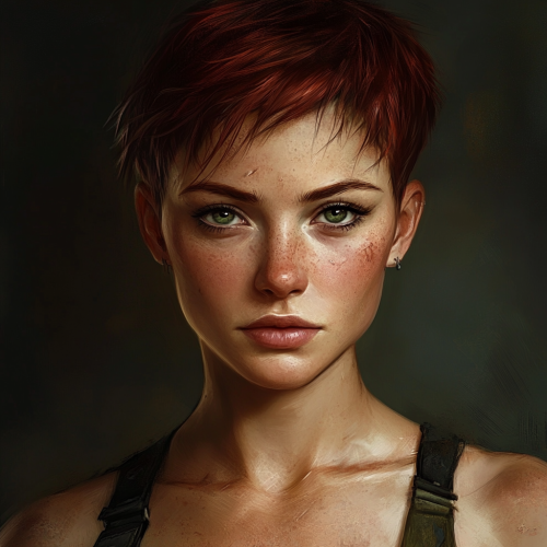 A fit woman in her early 30s. She has short, cropped hair thatis a deep red, and has complementing green eyes that are sharp and observant. Her skin is fair and has small battle scars.