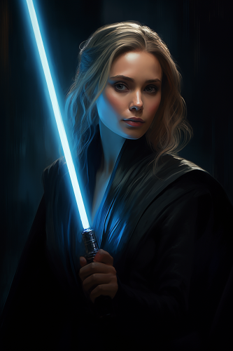 A portrait of elizabeth olsen is a jedi, beautiful blonde hair, slender black jumpsuit, half grin, blue laser sword in hand, jedi tepmle in background, with subtle elements of fantasy and magical realism, painted with the dark and dramatic style of the Baroque period --ar 2:3