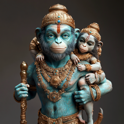 Walking Monkey faced Hanumanji, carrying Shri Ram(clean shaved, light blue complexion) on his left shoulder, carrying Lakshman on his right shoulder, clearly formed hands, face and eyes, highly detailed, photorealistic lighting