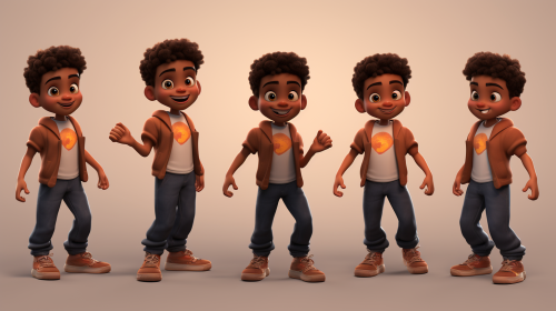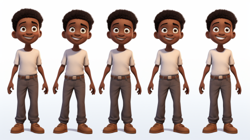 African American boy, 6 years old, cute, pixar style, multiple poses and expressions, character sheet, t-shirt, jeans, sneakers, full body --ar 16:9