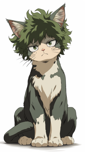 Create an image of Izuku Midoriya from 'My Hero Academia' reimagined as a cat. The cat should have green fur with black spots, reflecting Midoriya's messy green hair. The cat's expression should be determined yet kind, capturing Midoriya's hardworking and compassionate nature. The background should be simple, focusing on the cat's heroic and dedicated personality. The art style should be anime-inspired, bringing out Midoriya's essence in a cute, feline form. --ar 9:16 --niji 6