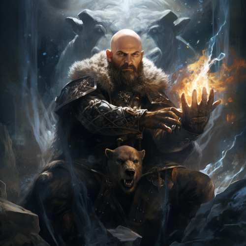 **a bearded and bald black elven mage is casting the magic missile spell at a bug bear. He looks very determined and powerful. High definition. High detail. Very magical moment. Style of graffiti portrait.