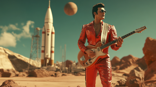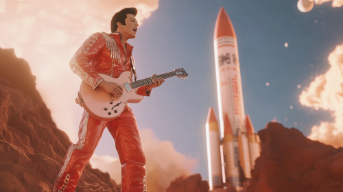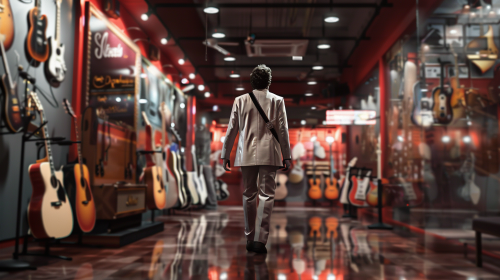 Elvis Presley walking through a Guitar Center showroom, hyperrealistic, --aspect 16:9