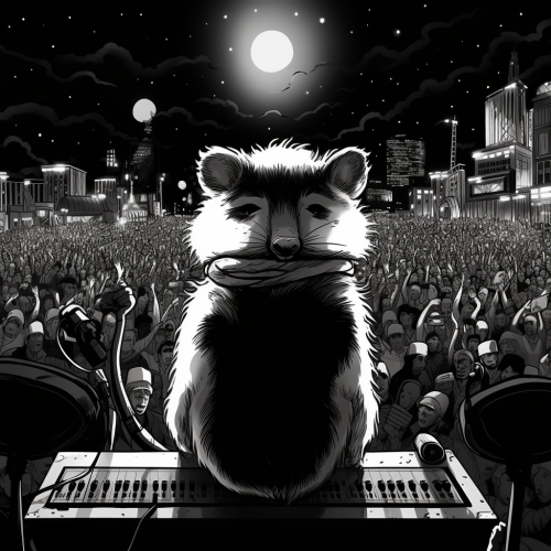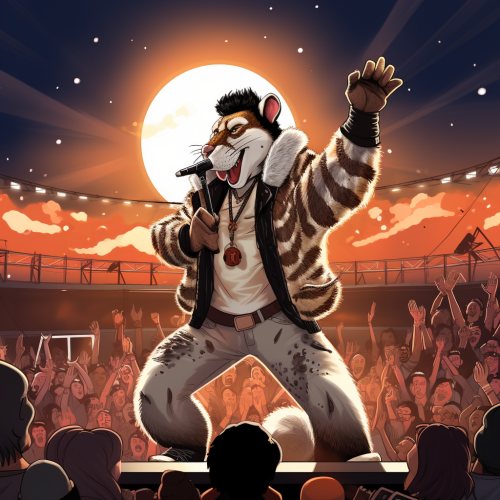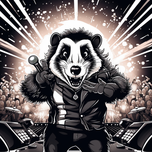 a human-like badger in Elvis Presley style, in concert at night, view of the whole stage from the front, in black and white cartoon style