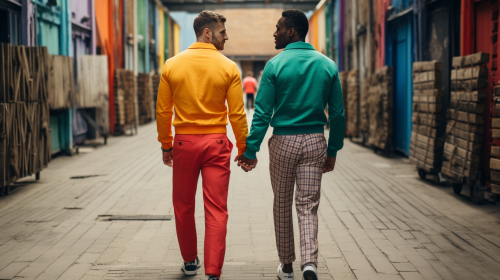 Men holding hands and walking away from the camera wearing united colors of benetton style clothing --ar 16:9 --v 5.2