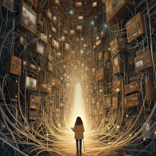 web graphic, facebook header, connection of everything, curiosity, knowledge minimalistic style, web-art, illustration --ar 13:6