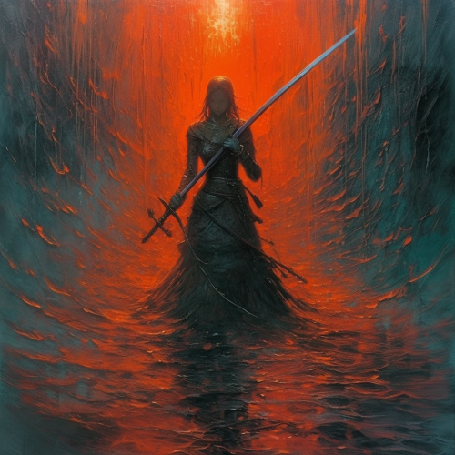 Grimdark young maiden embracing a great sword in the middle of a scarlet water spring, oil paint, dripping paint, dramatic pose, dramatic brushstroke, by Zdislaw Beksinski, by Kouichirou Harada, bloodborne, darksouls, nightmare, horror