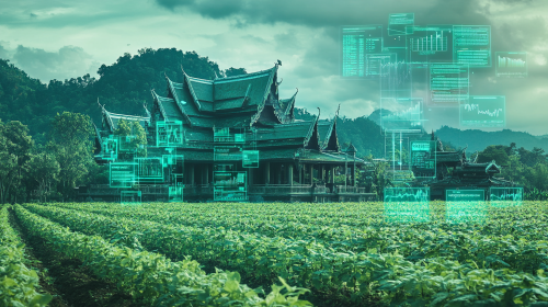 Emerald green fields and plantations with a traditional Thai-style building in the background. Floating in the air are holographic trading graphs and charts, creating a futuristic atmosphere for a trading tournament --ar 16:9