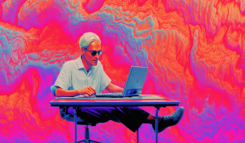 Wall Street Banker conducting business, April Greiman, Susan Kare, Emigre, Pacific Wave, early rave flyer graphics, The Mind's Eye, harsh pixelated thermographic imagery with warped fonts, first wave image manipulation software, heavily-saturated, warped, overlaid on-top of each other with various photoshop effects, xeroxography, Windows 95 PC graphics, recurring acid/infrared vision versions of green, yellow, orange, and purple, early 90’s, --ar 56:33 --chaos 50 --weird 1000