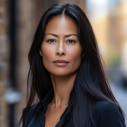 A realistic portrait of Emily Carter, a confident and intelligent 43-year-old CMO of a high-end cosmetics brand, looking directly at the camera with a warm yet direct expression. She is street stylish and contemporary, with long hair and natural but elegant make up. Emily is of mixed-race descent, reflecting the diversity of modern Britain. The backdrop is a quintessentially London scene, perhaps a London urban street with Georgian architecture, blurred to emphasize her presence. Cinematic lighting, sharp focus. --v 6.1