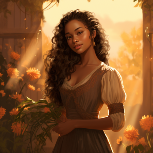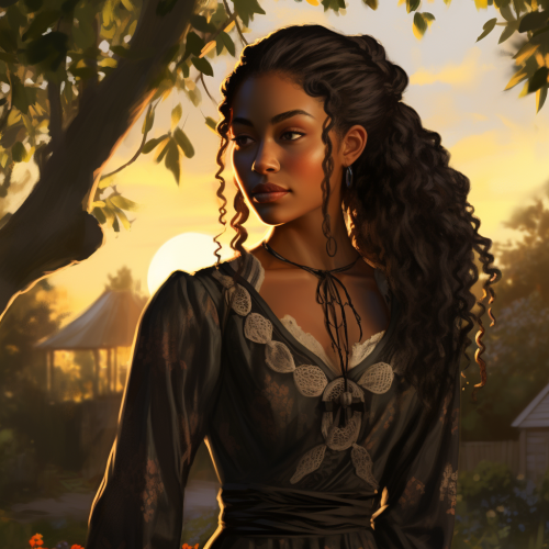 Illustrate Emily Byrd Starr standing in the garden in the rays of the setting sun. Emily has long, black braids that cascade down to her shoulders. Her eyes are gray, full of curiosity and sharp intelligence. She is wearing a long dress that complements the bouquet of flowers she holds in her hand. Her posture is graceful, and her face exudes tranquility and focus, while she is surrounded by the beautiful New Moon garden, filled with colorful flowers and trees. This illustration is meant to capture the beauty and independence of Emily, as well as her connection to nature and the garden. Canada 1910