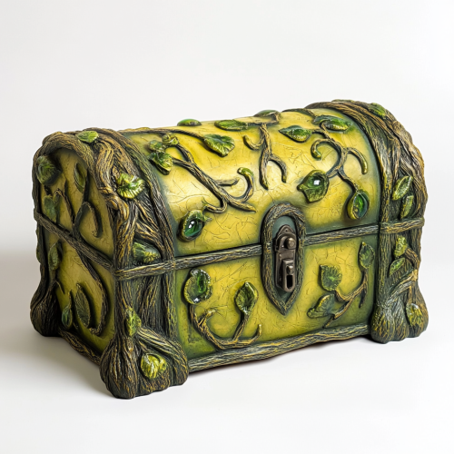 A photorealistic image of a treasure chest set against a plain white background, designed in shades of lime green and emerald green. The treasure chest has a textured, earthy finish, with intricate vine and leaf patterns carved into the surface. The body of the chest blends bright yellow-green and deep forest green tones, giving it a natural, mystical appearance. Small accents like moss and tiny gemstones add an enchanted, forest-like feel. The white background highlights the vibrant green hues and organic details, making the chest appear both mysterious and connected to nature. Created Using: high-resolution photography, earthy lighting,