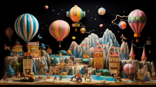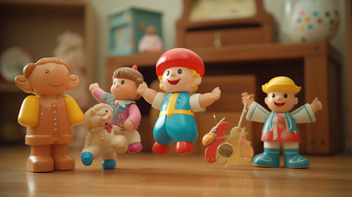 a little wooden soldier and stuffed animals toys are dancing, gliding, and laughing in the chest, in living room, lively , fairy tale, cartoon style, size 16:9, --ar 16:9