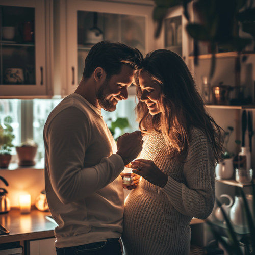 happy couple with positive pregnancy test, photo morning sun, BACKGROUND: minimalistic modern well lit contemporary home, LIGHTING: white bright lighting, photorealistic, hyper realistic, 5k, taken by a professional camera, High Contrast, 5D, 800K, studio lighting, Insanely Detailed and Intricate CAMERA: :Nikon Z 6II Camera LIGHTING - Bright lighting, photo realistic --v 6.0