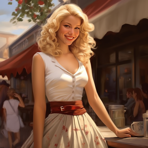 extremely beautiful blonde, short midriff, sundress skirt, southern style look, smiling at me
