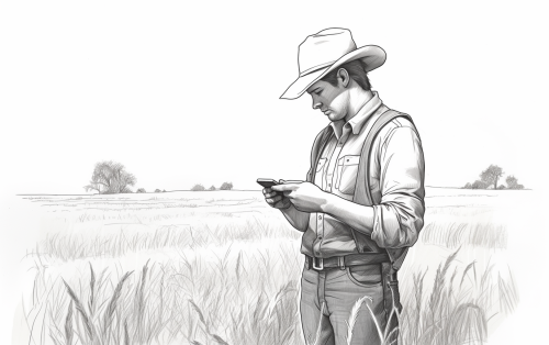 cow talking to farmer. The farmer is holding a coffee mug and empty milk carton upside down. A minimalist comic-style child's drawing in black and white with simple line art. The drawing is primitive and lacks any background or shadows, onli contour. The overall composition is clean and uncluttered.