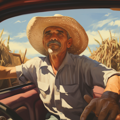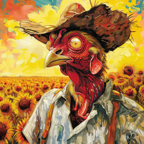 simple black and white child's drawning, of an old tractor overturned, after accident, a wheel driving away, farmer with modern farmer standing and looking at broken tractors