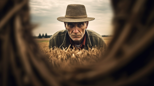 a heavy man dressed as a farmer. He is wearing a patchwork synthetic skin facemask. He is carrying a large screw driver. He is in a barn.