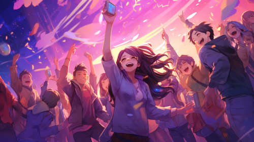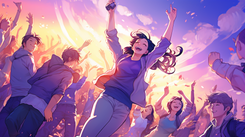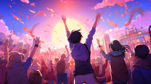 anime illustration of people dancing on a festival, voilet background, big crowd, hands up, dancing, anime, purple colours, --ar 16:9