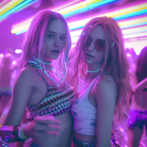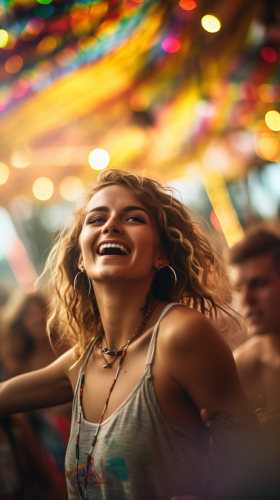 cheerful dancing caucasian crowd, colorful, summer, vivid colors, energetic, colorful bokeh stage lights in the background, colorful bokeh stage lights in the foreground Sony Alpha A7R IV, lens canon EF24-70mm f/2.8 LVSM II, 8K --v 5.2 --ar 9:16