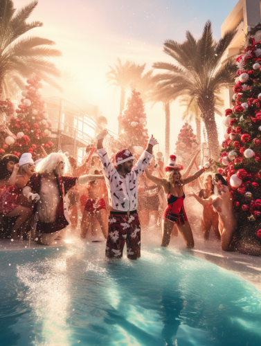 photo of a ibiza pool party with dancing people between christmas trees --ar 3:4