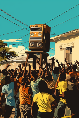 jamaican crowd dancing around a craft sound system corner in the street during the seventies. Roots vibes. Elegant line art style warm colors blue sky in background add noisy grain --ar 2:3