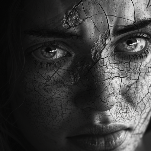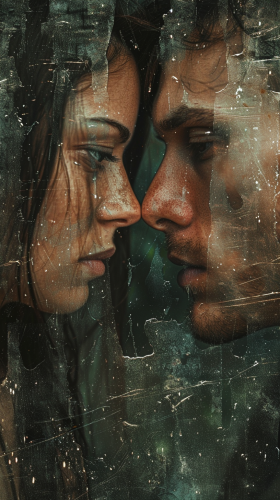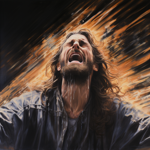 a man sitting on a bench with his hand on his head in distress. The background is black and the foreground in white. There are scratches on the image depicting his mental stuggle ar--9:16.
