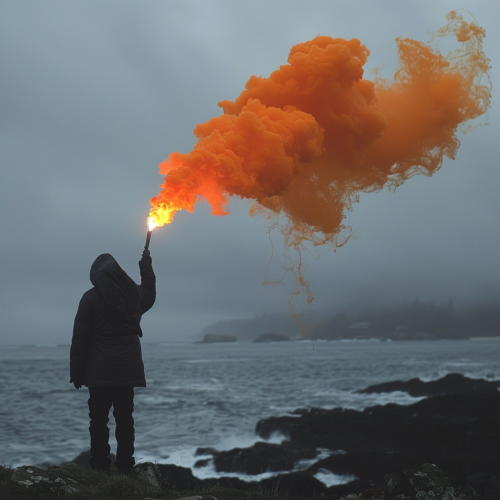 person in distress holding a smoke flare that produces orange smoke --s 250