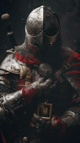 A medieval knight looking distressed in battle, clutching a small locket with a painting of a cat, dramatic lighting, realistic style --v 6.0 --ar 9:16