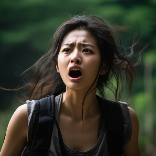 strong cognitive dissonance in a bad way, strong emotions, shouting, denial, A surprised Korean 19 year old female person with and shock, summer daytime at the forest, Taken using a Canon EOS R5 moonlight 50mm lens, --style raw --v 5.2 --s 250