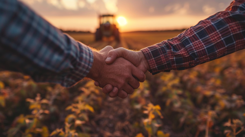 emotional handshake between a farmer and a truckdriver, a tractor and a semi truck in the background, editorial shot, golden hour, cinematic lighting, dutch angle shot, vibrant colors --ar 16:9 --style raw --s 750 --v 6.0