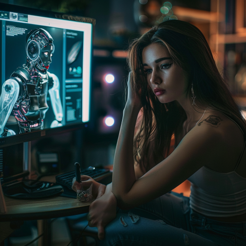 a photo of a brunette woman in jeans and tank top falling in love with the AI on the other side of her computer screen