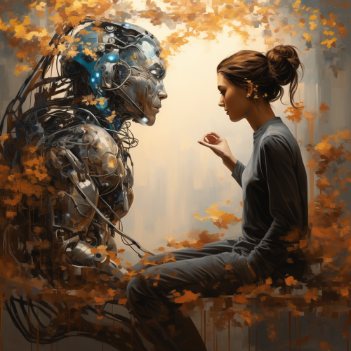 Create an artwork that portrays AI as a companion who listens, understands, and responds to the emotional needs of individuals, promoting a sense of empathy and connection
