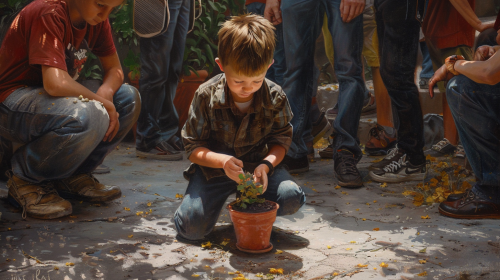photorealistic image of A man crouching down looking at an empty flower pot, the man is surrounded by people with their backs turned to him. --ar 16:9 --v 6.0