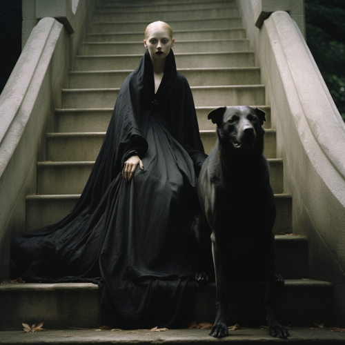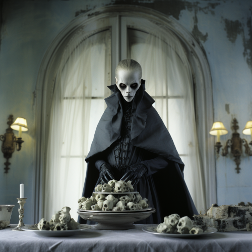 A hauntingly atmospheric scene of Nosferatu, the iconic vampire with pale skin and sharp, elongated features, in a dark, dimly lit alley. He is leaning in close, about to bite the neck of a beautiful woman. She is wearing a sleek leather jacket and tight leather pants that reflect the faint glow of the moonlight, adding a modern twist to the classic vampire scene. Her expression is a mix of fear and a strange allure, her head tilted slightly to the side as she succumbs to his grasp. The background is shadowy, with cobblestone streets and mist swirling around their feet, enhancing the eerie, gothic ambiance