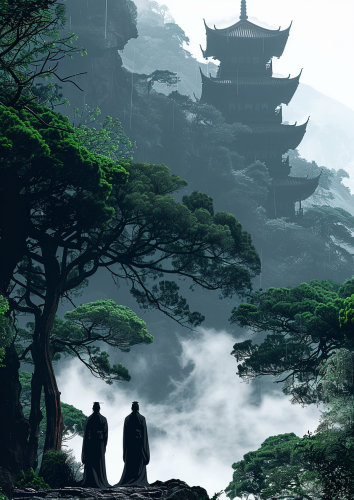 Painting of a traditional japanese samurai holding a katana in a fighting stance, ornate unique japanese mask and armor, golden armor, 1970's surrealist dark fantasy art style, book cover art, realist: lifelike accuracy, volumetric lighting, japanese garden and temple background, --style raw --ar 2:3 --v 5.2
