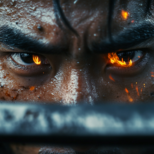 Samurai close-up, katana under the eyes, katana burning with birch-colored fire, birch-colored fire reflected in the eyes, focus on samurai eyes, focus on katana --v 6.1