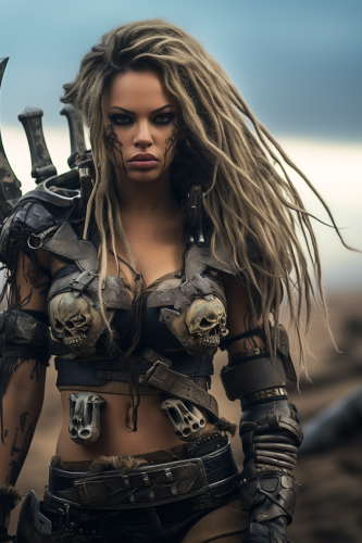 Fantasy Barbarian & Warrior woman windy hair Art post apocalyptic environment wearing a warrior outfit, full body, skulls, angst, misery, realistic horror, intricate details, extremely realistic, editorial photography, cinematic, uhd, hdr --v 5.2 --ar 2:3