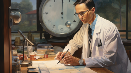 Depict a powerful cyclone wreaking havoc on a modern medical clinic. The cyclone's fierce winds swirl around, lifting debris and shattering windows. Medical equipment, chairs, and documents are seen flying out of the building. Dark clouds and intense rain add to the chaotic atmosphere, with lightning illuminating the scene. The clinic’s sign is partially torn, and the building's structure shows signs of severe damage. The surrounding area is littered with debris, showcasing the destructive force of the storm.