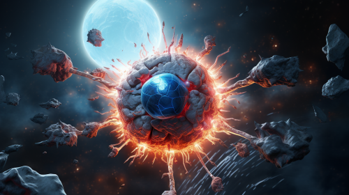 a 3D illustration of leukocytes attacking a Cancer Cell as oncology, futurism, Ultra high definition, ultra realistic, ultra detailed , blue tones --ar 16:9 --v 5.2
