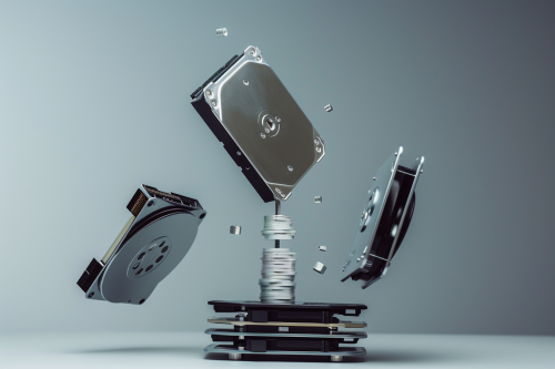 hard drives in precarious equilibrium and unbalanced positions balancing on some upturned metal rods, of various heights, on a grey studio background. Flat bright cold diffused light. --ar 3:2 --v 6.0